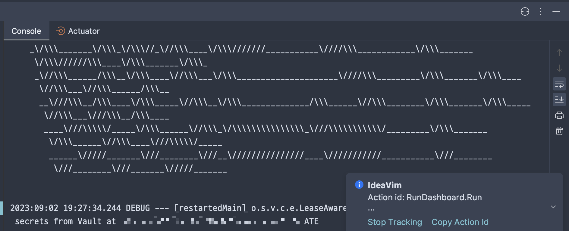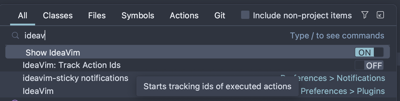 shift를 두 번 눌러 ideavim을 입력 후 Track Action Ids On 하면 인텔리제이에서 사용하는 ActionId를 Copy 할 수 있다.