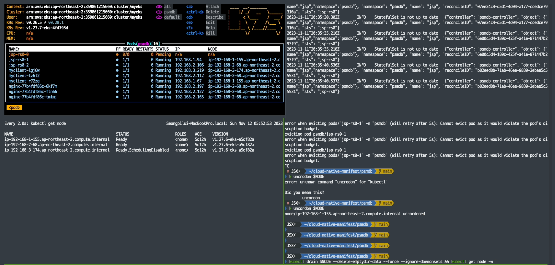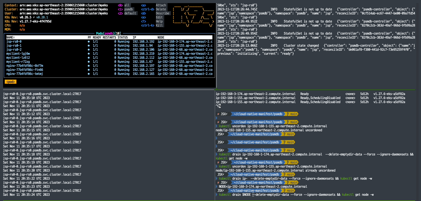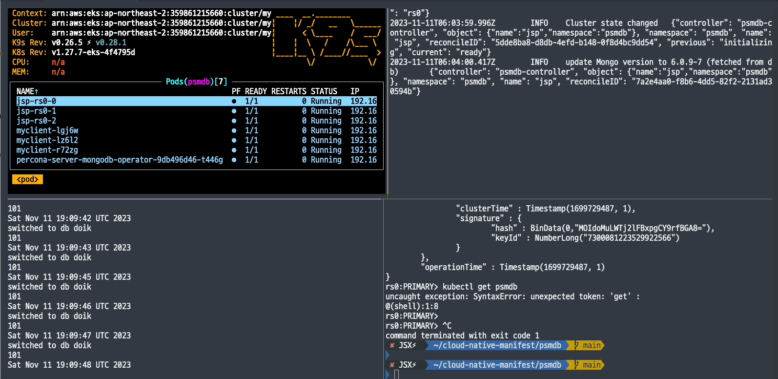 kubectl ns psmdb # 기본 네임스페이스 변경(kubectl krew 플러그인)