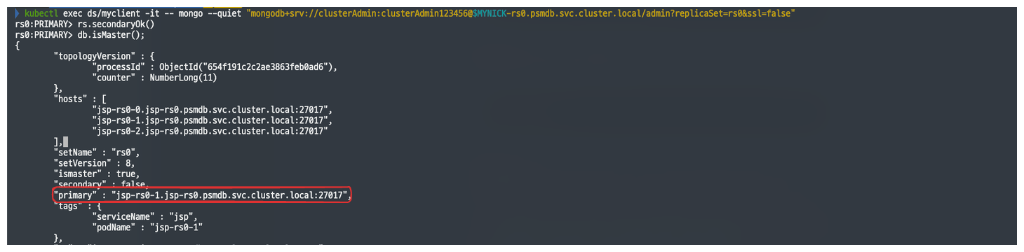 "connectionString" : "rs1/jsp-db-rs1-0.jsp-db-rs1.psmdb.svc.cluster.local:27017,jsp-db-rs1-1.jsp-db-rs1.psmdb.svc.cluster.local:27017,jsp-db-rs1-2.jsp-db-rs1.psmdb.svc.cluster.local:27017",