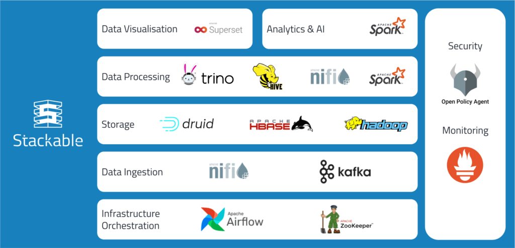 Welcome to Stackable! This documentation gives you an overview of the Stackable Data Platform, how to install and manage it as well as some tutorials. Introduction The Stackable Data Platform allows you to deploy, scale and manage Data infrastructure in an