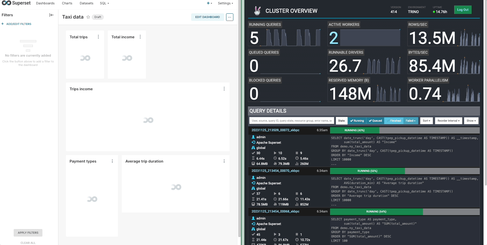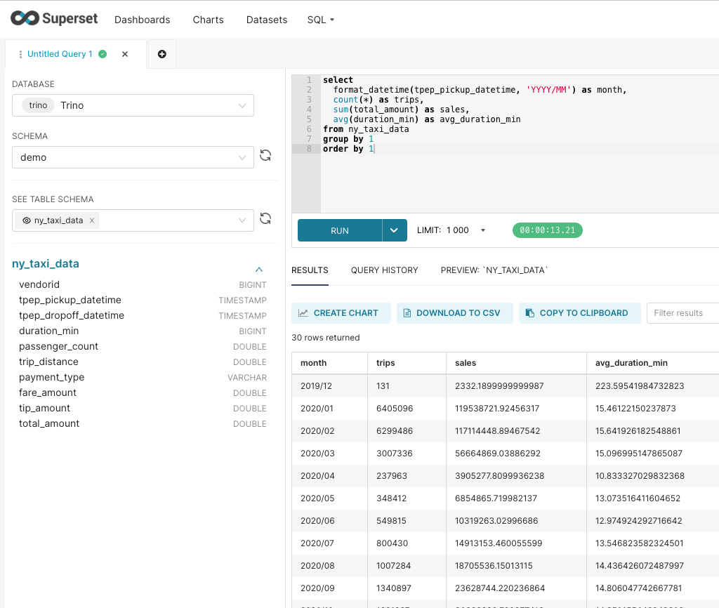 Description Demo loading 2.5 years of New York taxi data into S3 bucket, creating a Trino table and a Superset dashboard