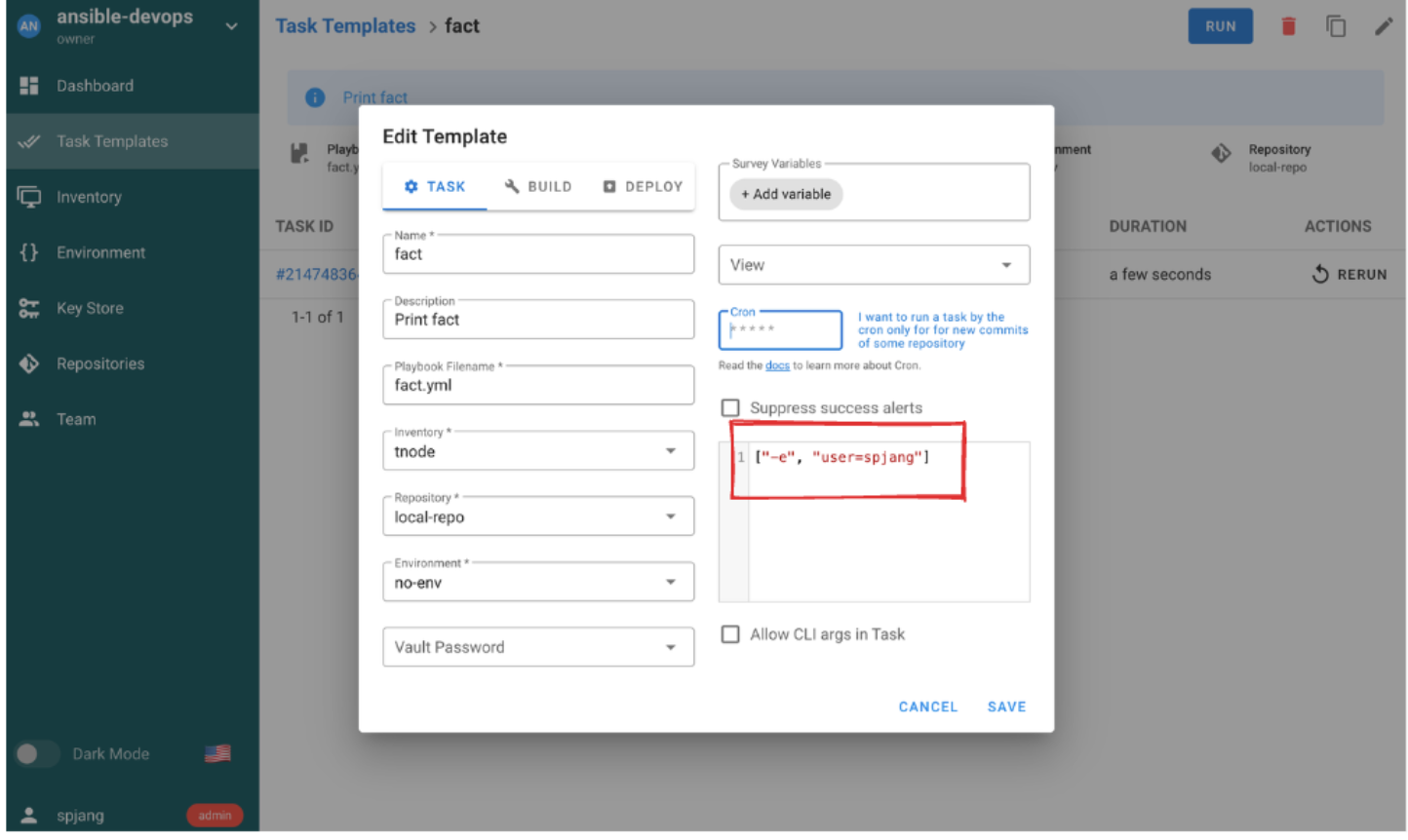 태스크 실행 시, 우선순위가 제일 높은 앤서블 매개변수를 추가할 수 있습니다.
