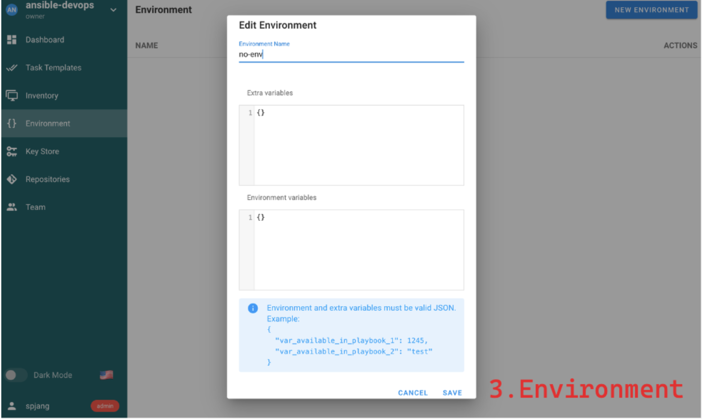 - Environment : 인벤토리에 추가 변수 저장하는 곳으로 JSON 포맷으로 작성