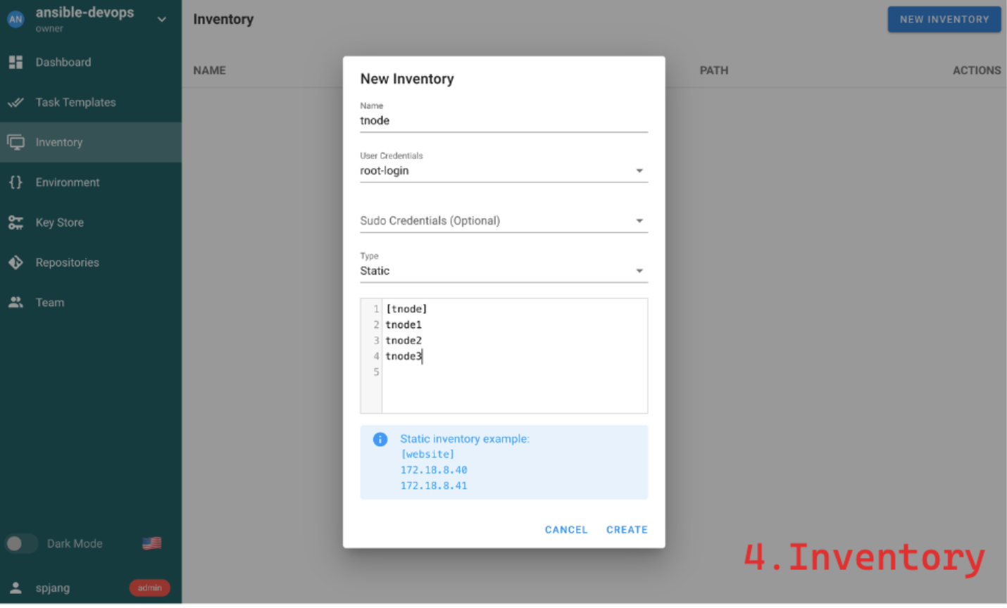 - Inventory : playbook가 실행될 호스트 목록, 변수 사용 가능, YAML/JSON/TOML 포맷