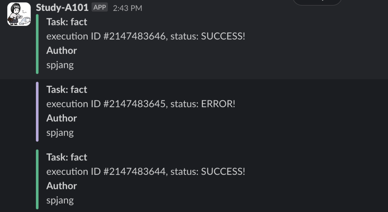 설치 시, Slack Webhook URL 설정과 알람여부를 yes로 허용하면, 태스크의 결과를 슬랙에서 확인해 볼 수 있습니다.