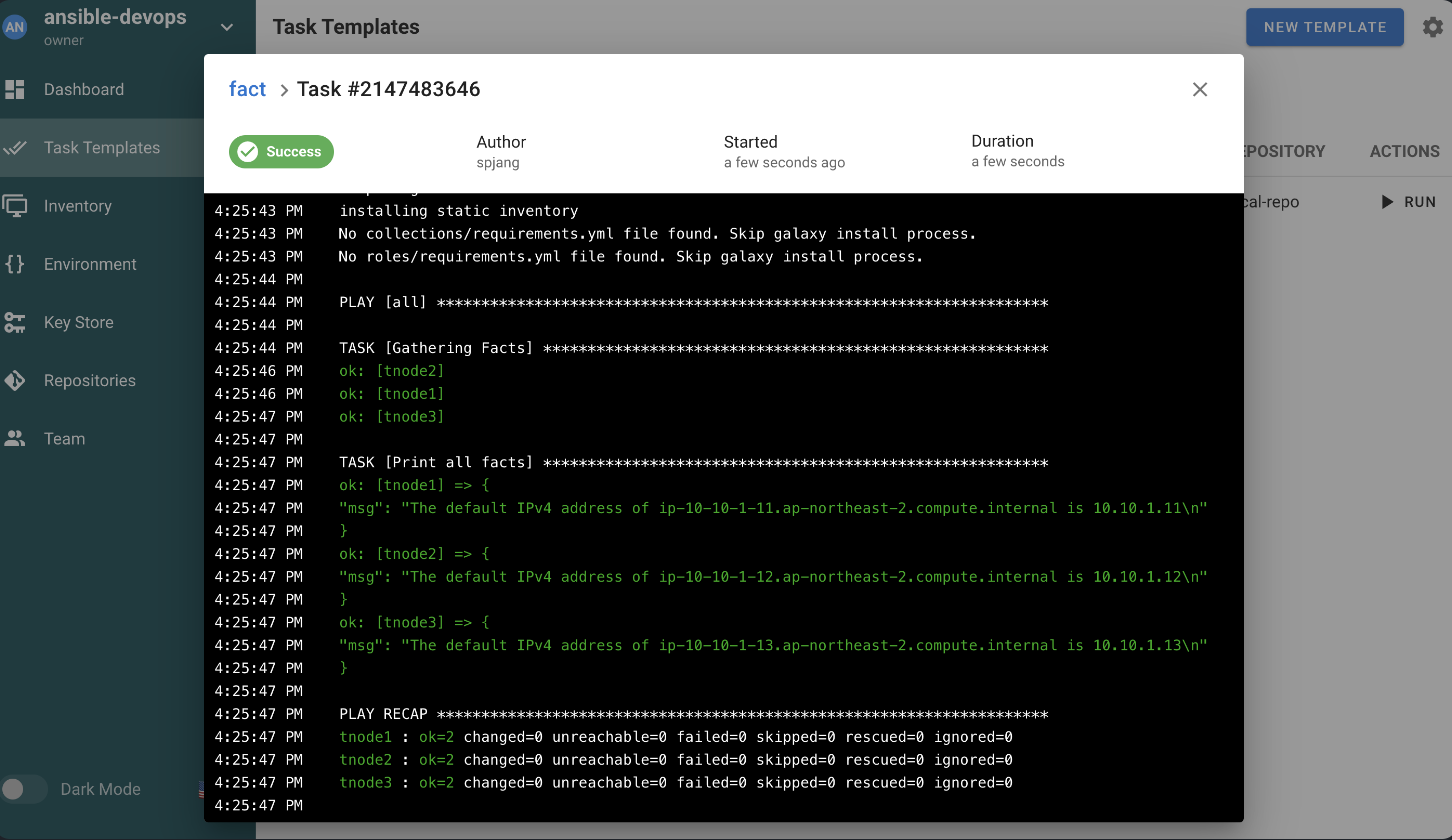 위에서 간단한 fact변수를 출력하는 태스크를 등록하였는데, 실행하고 결과를 확인합니다.