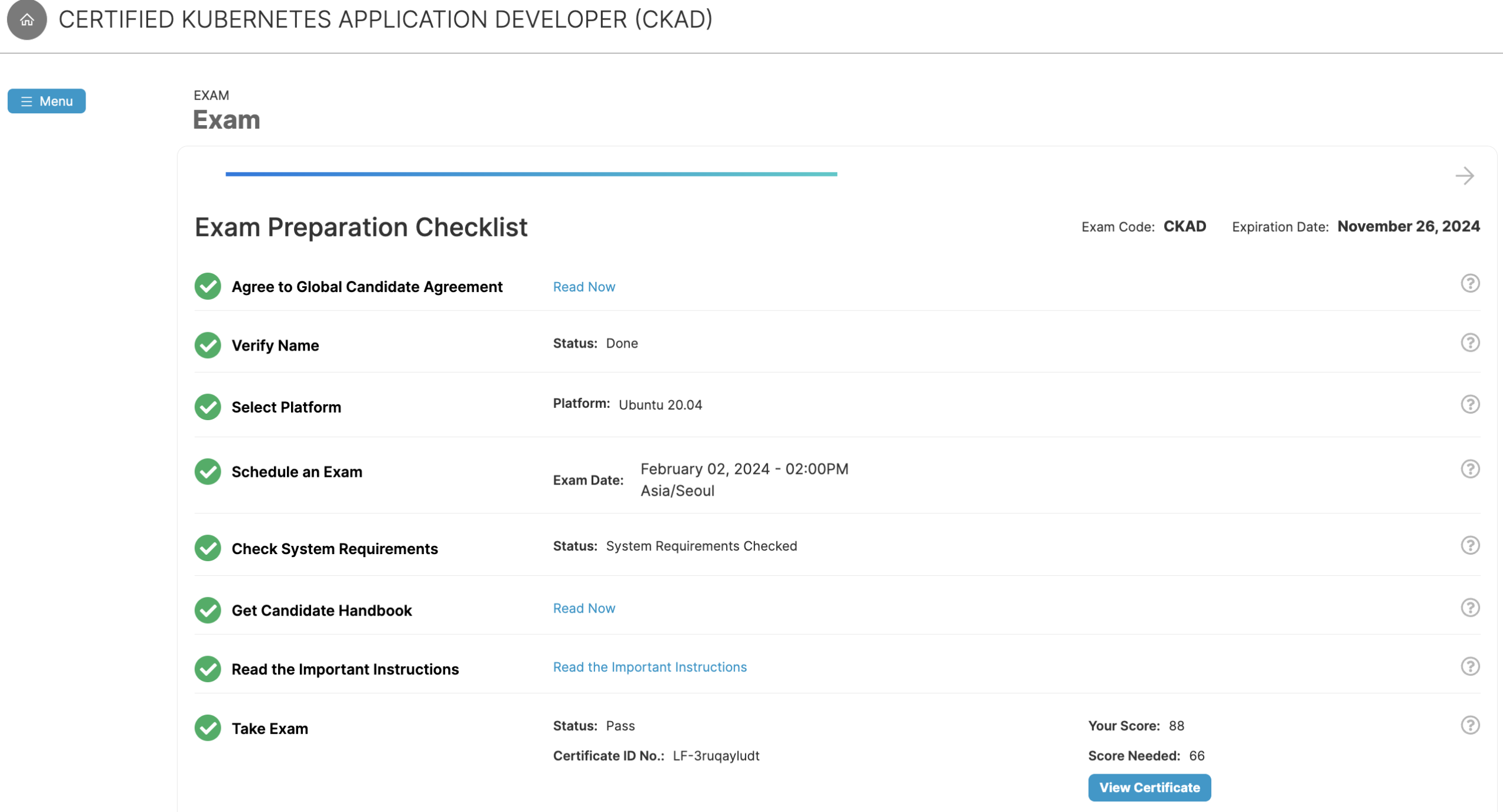 - CKA를 열심히 준비했다면, 따로 CKAD를 준비하지 않고 바로 응시하여도 할만하다고 생각한다.