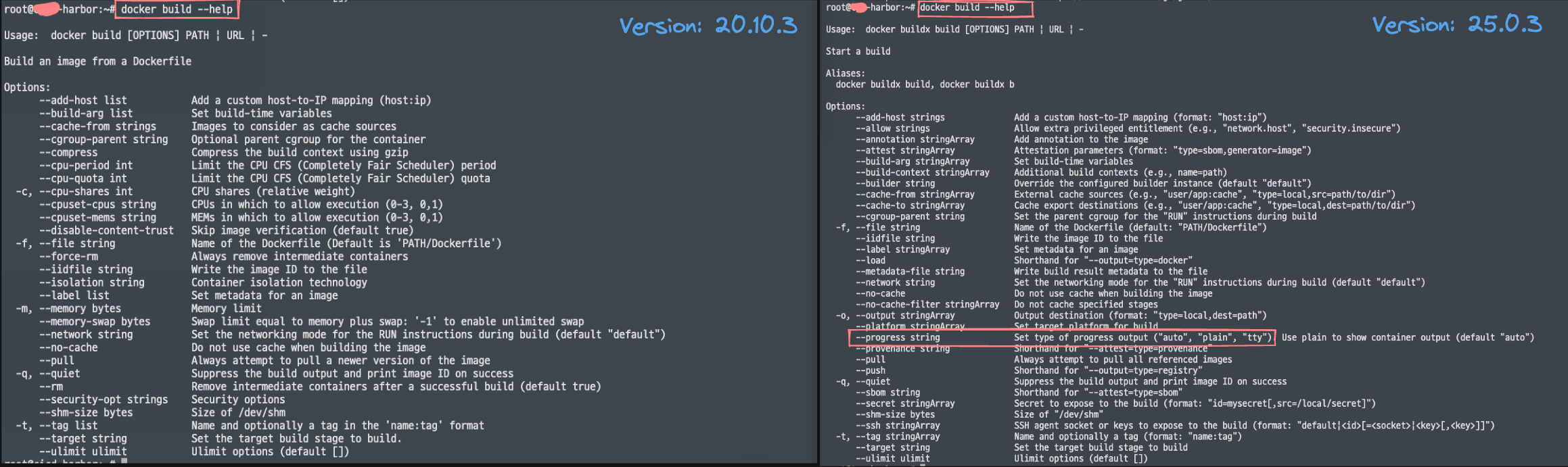 docker build --help 명령어를 보면 --progress라는 옵션이 생긴 것을 볼 수 있다.