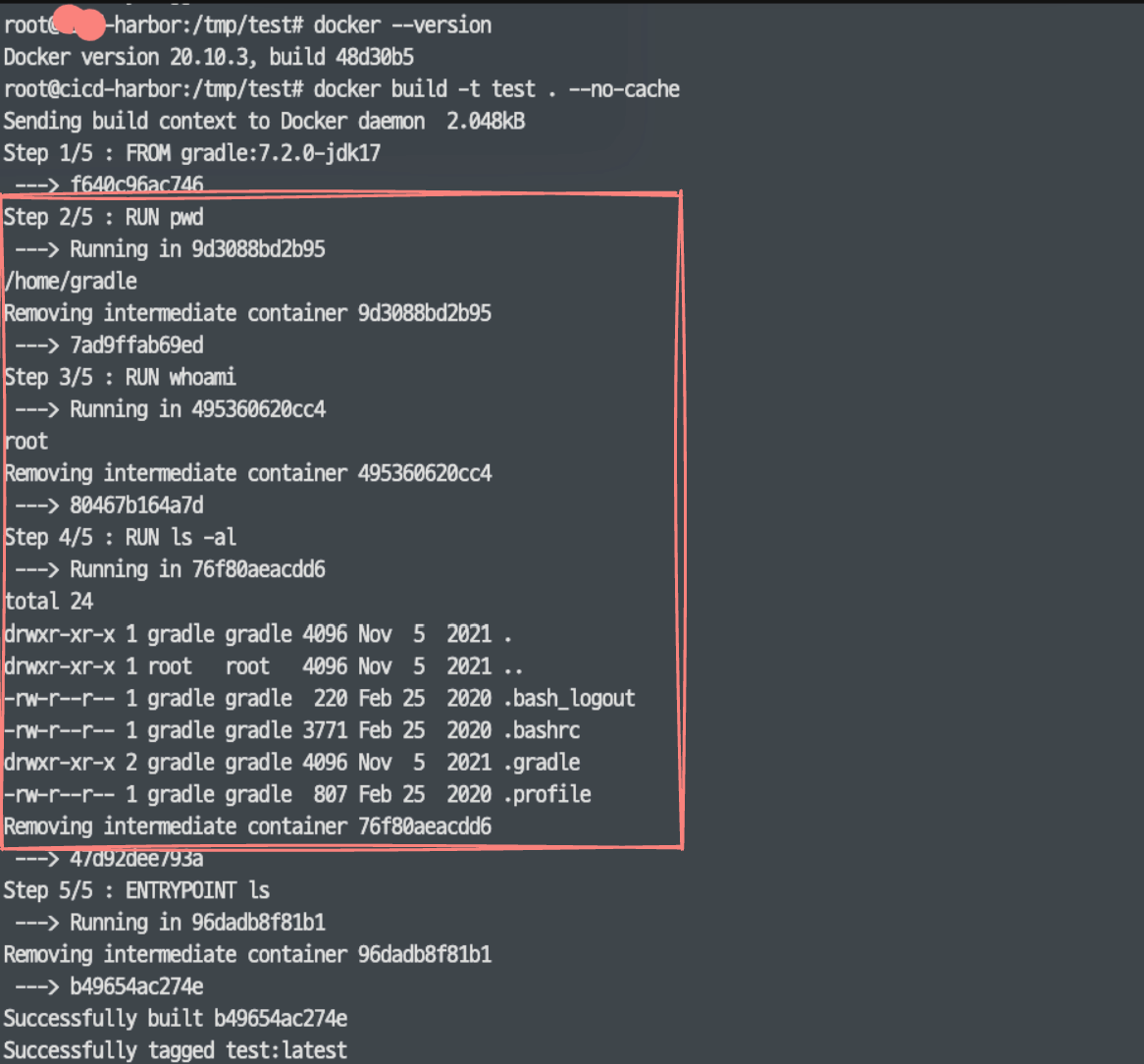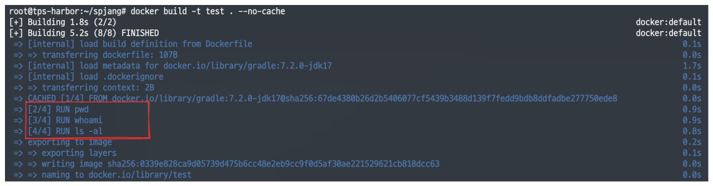 최신 버전의 도커 버전으로 업데이트되면서 변경된 건가 해서, 구버전의 도커로 다시 수행해 보니 역시 빌드 명령어 결과가 보였다.