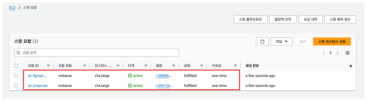 AWS 콘솔에서 스팟 요청 카테고리를 통해 spot instance를 확인할 수 있습니다.
