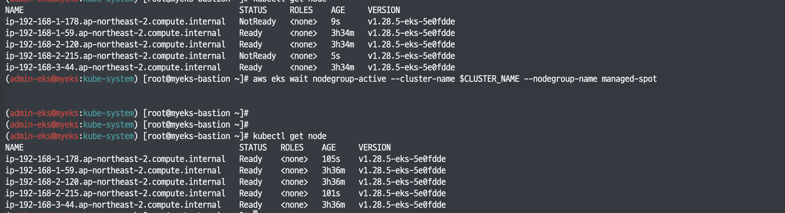 ip-192-168-2-120.ap-northeast-2.compute.internal Ready <none> 3h28m v1.28.5-eks-5e0fdde ON_DEMAND