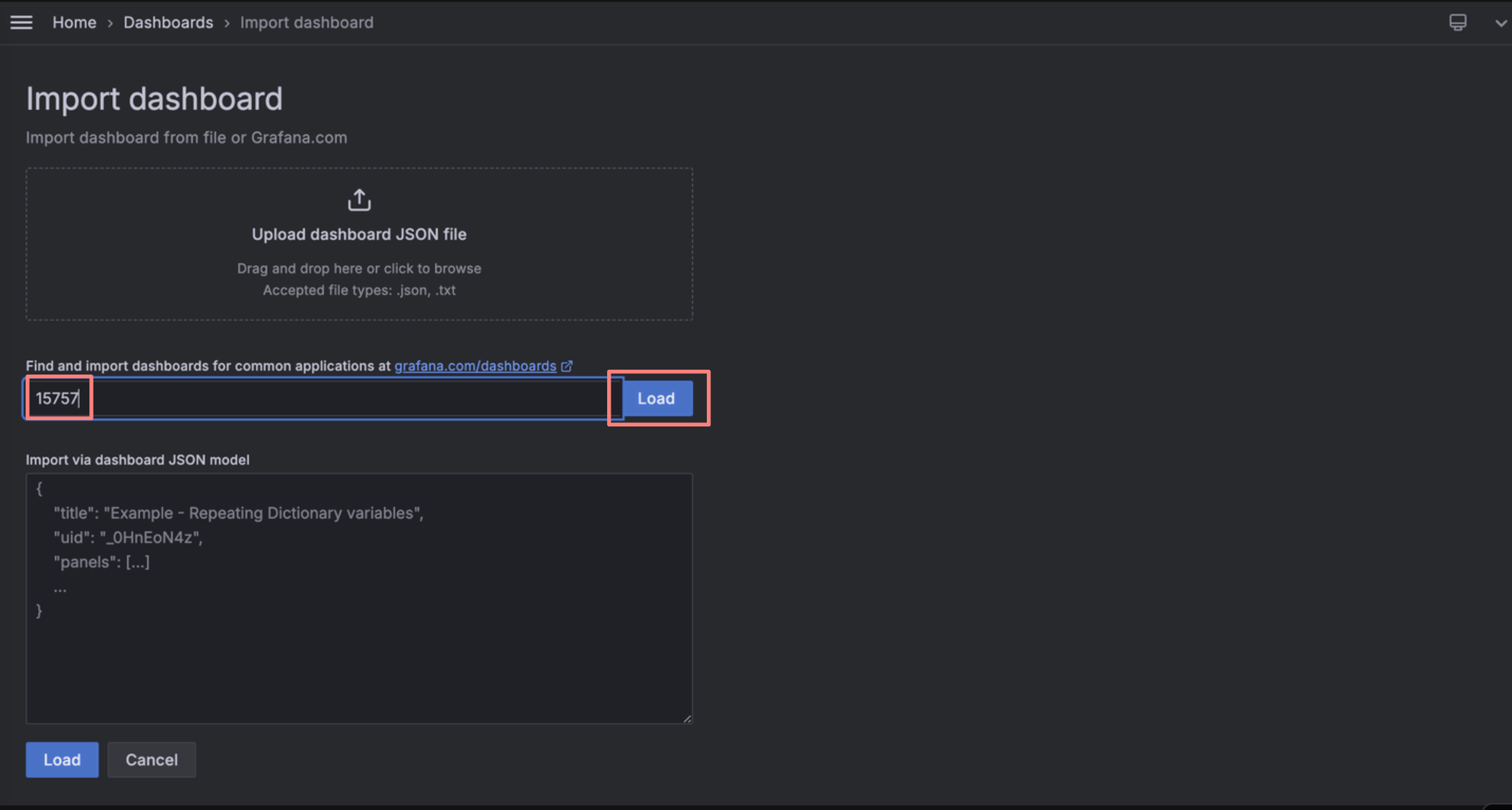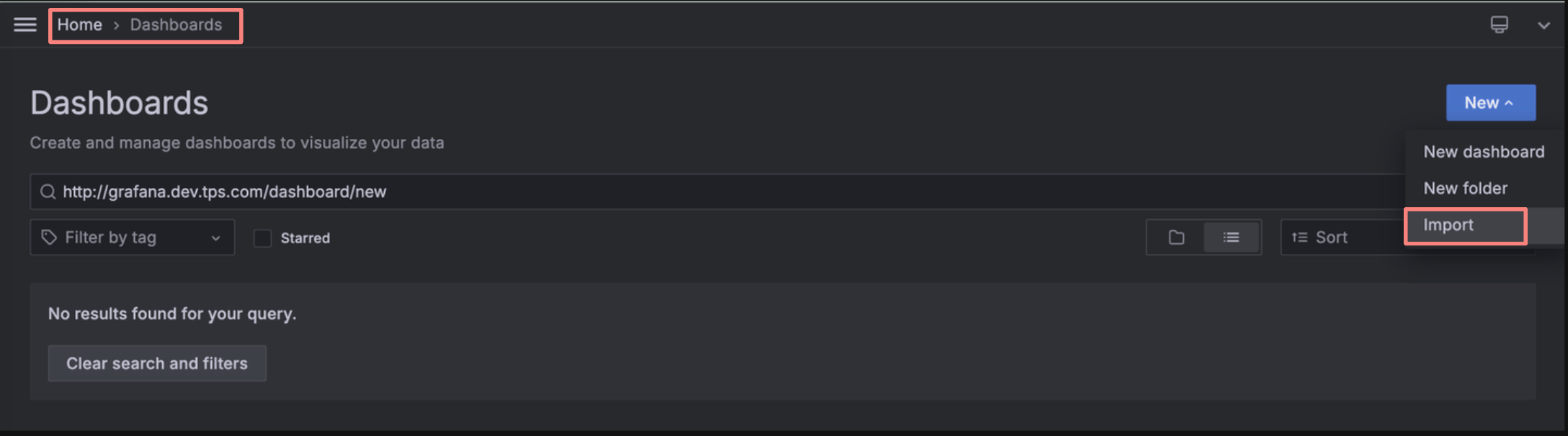 Home > Dashobards 메뉴에서 import 버튼을 통해 수많은 사용자들이 제공하는 대시보드를 손쉽게 불러올 수 있습니다.