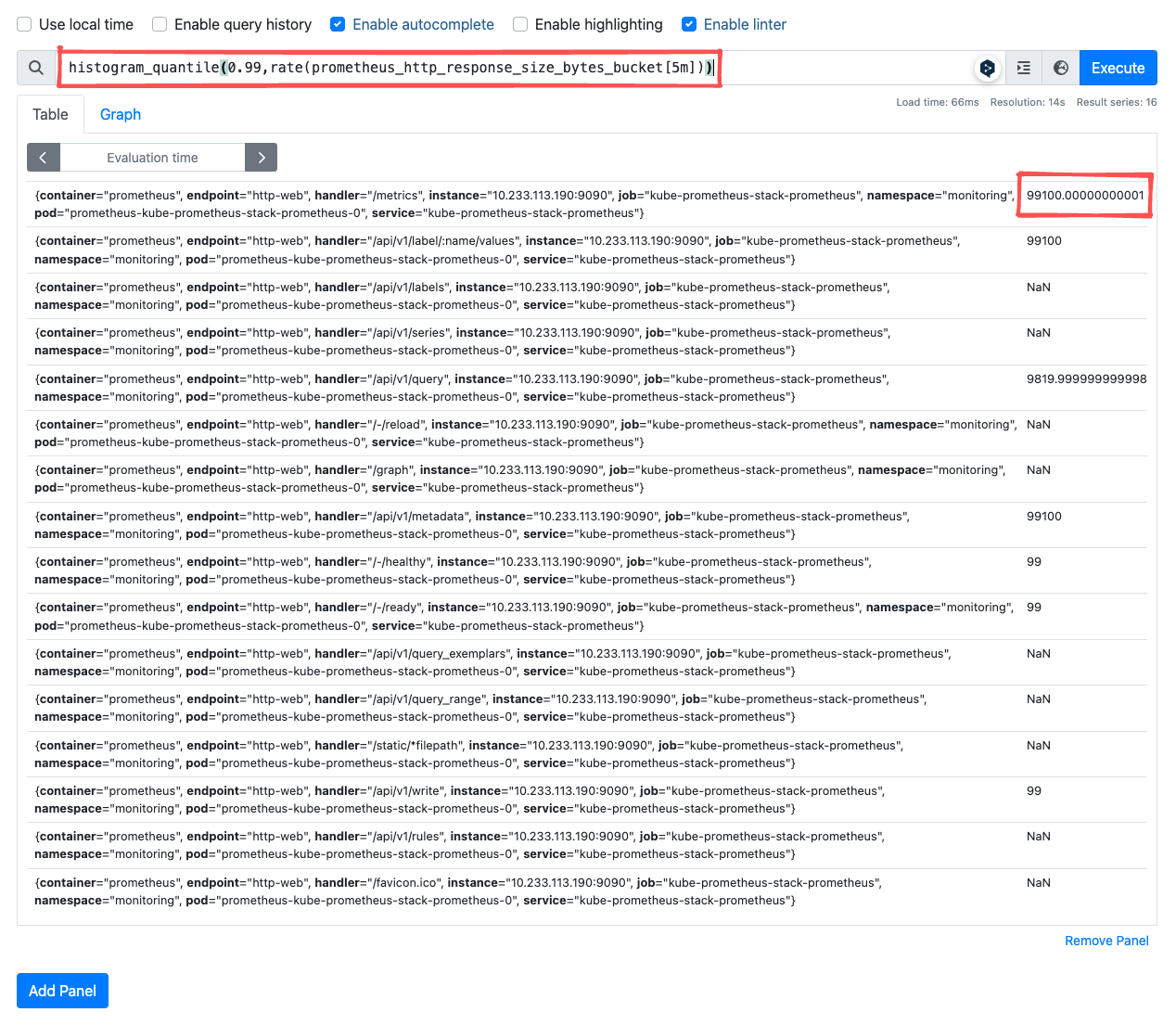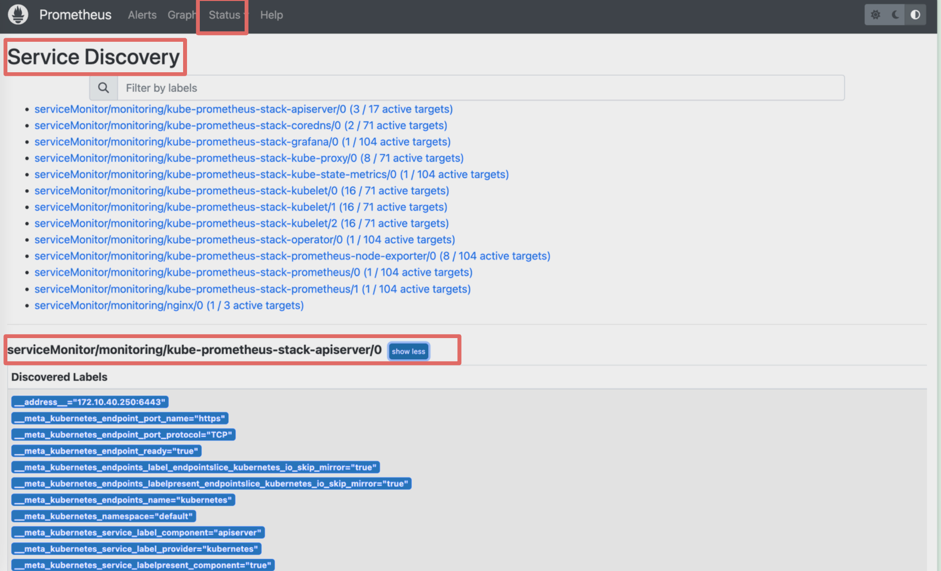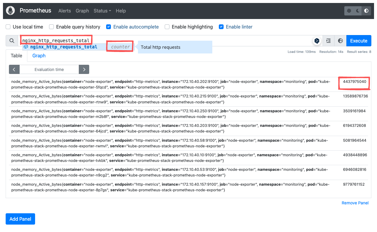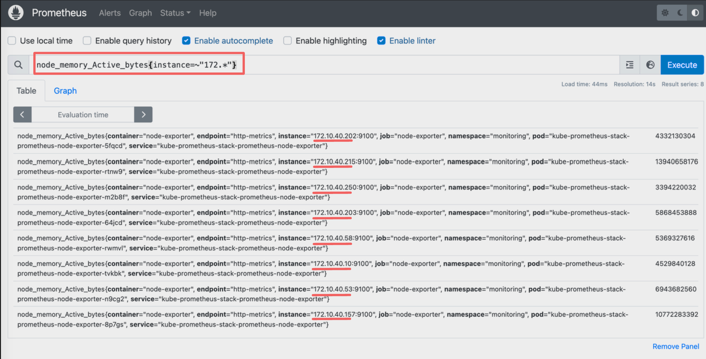 레이블 매처의 정규표현식을 활용하여 172 대역인 노드의 정보만 필터링할 수 있습니다.