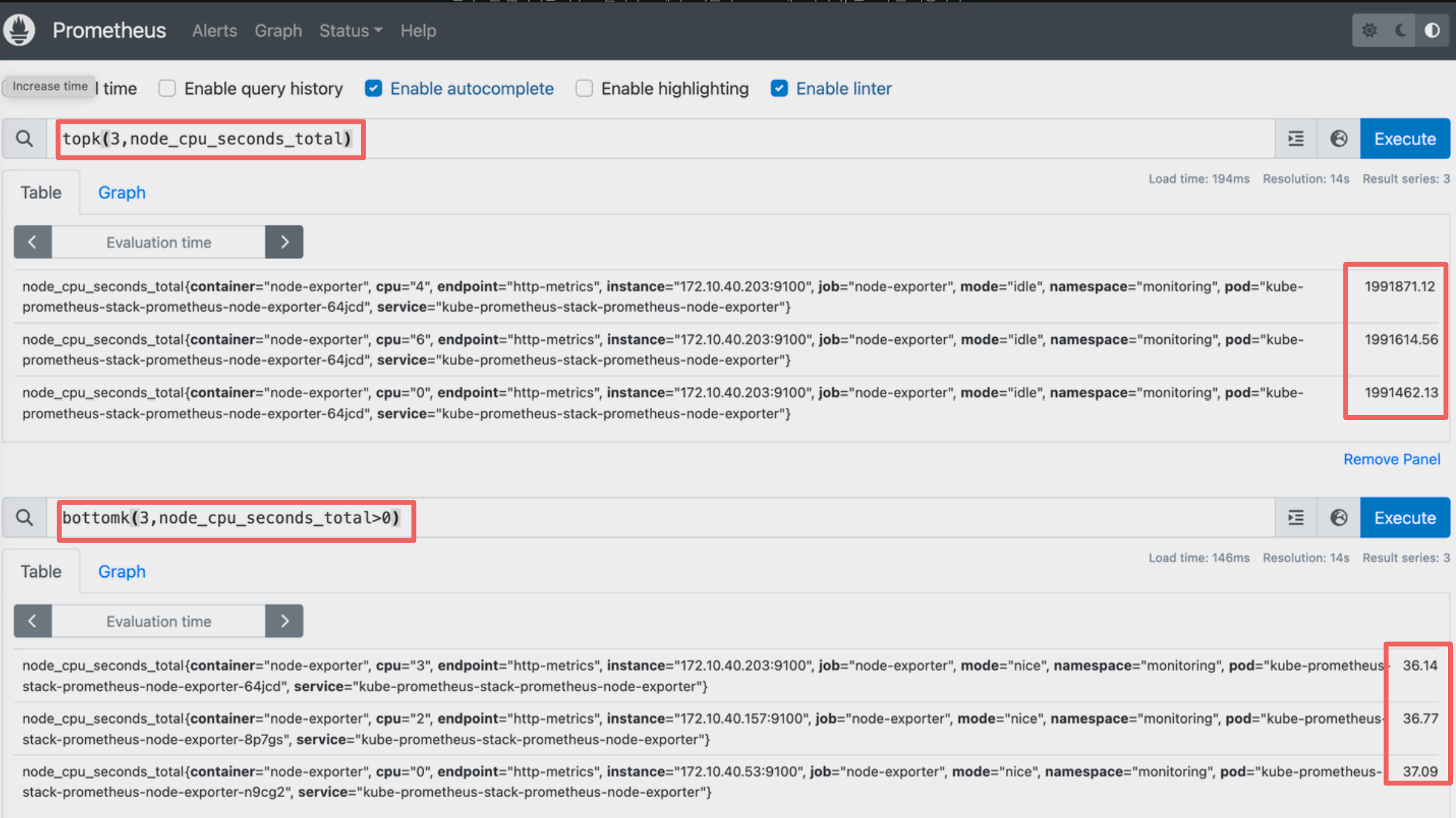 집계연산자 topk , bottomk를 사용하여 node cpu 사용 최상위, 최하위 Top3 노드의 결과를 가져옵니다.