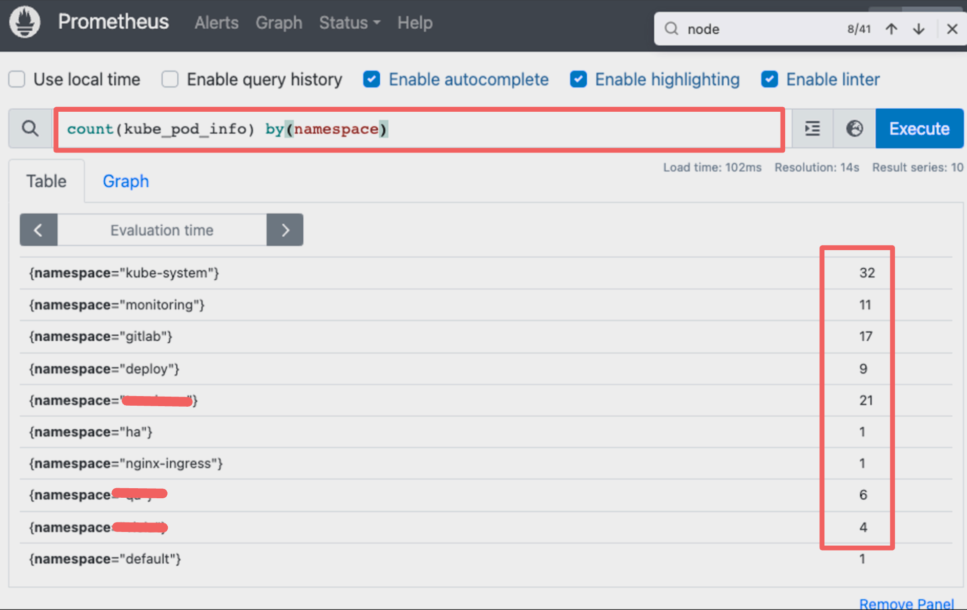 count(kube_pod_info) by(namespace)
