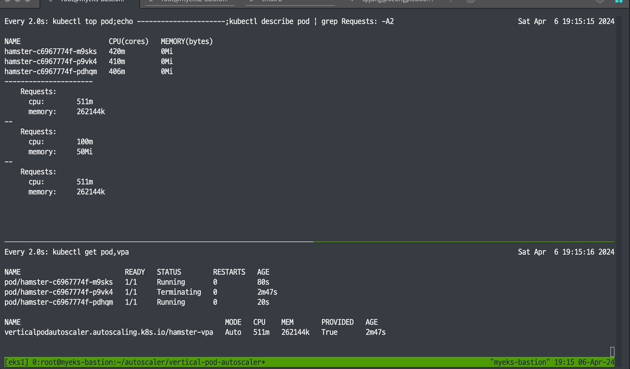디플로이먼트의 레플리카 수가 5개로 증가하면서 노드가 스케일 아웃되는 것을 확인할 수 있습니다. 파드의 pending 상태가 약 40초가 정도 되지 않아, 스케일링됨으로 빠른 스케줄링 기능을 확인 할 수 있습니다.