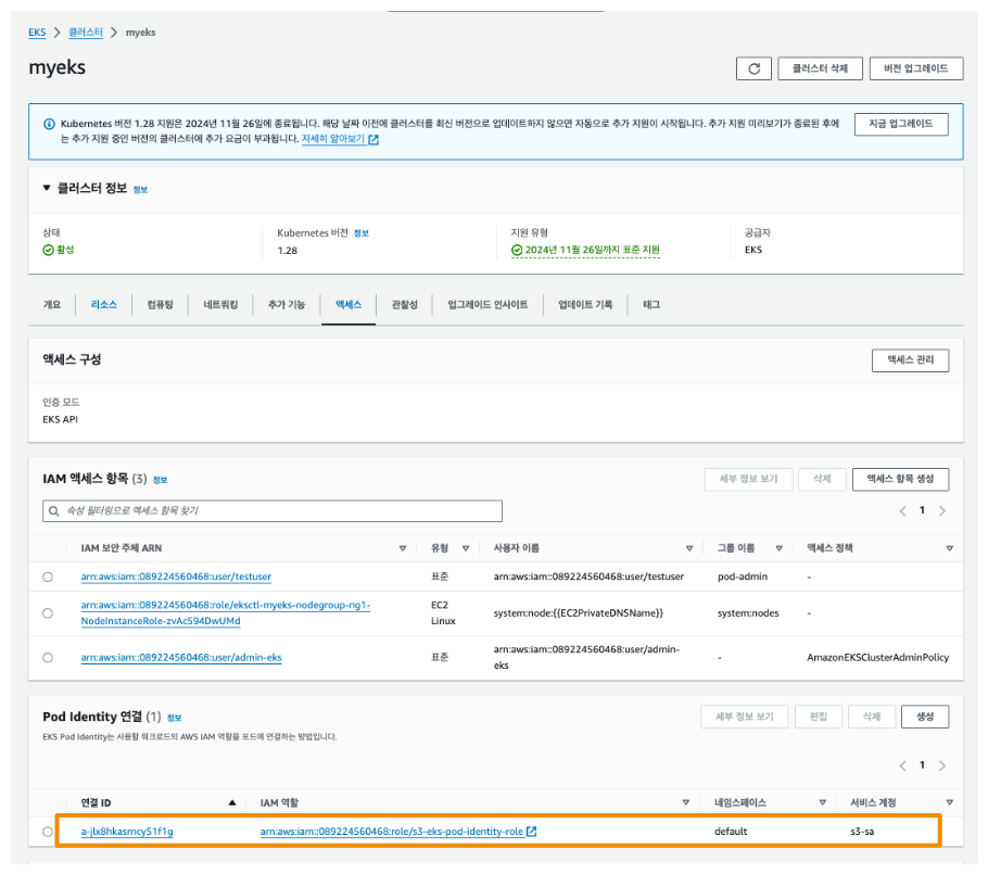 arn:aws:eks:ap-northeast-2:911283464785:podidentityassociation/myeks/a-blaanudo8dc1dbddw default s3-sa arn:aws:iam::911283464785:role/s3-eks-pod-identity-role