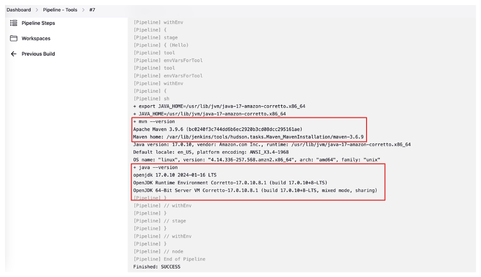 설정한 Tools를 사용할 수 있도록 파이프라인 스크립트를 작성하고, 설정한 버전을 확인하는 명령어로, 간단하게 명령어를 사용할 수 있는지를 확인합니다.