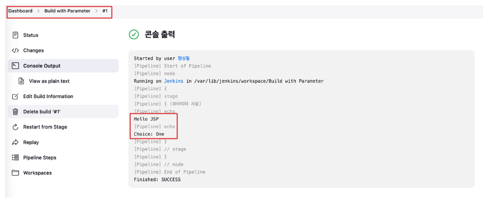 파이프라인을 사용하다 보면 입력값(파라미터)을 활용이 필요한 경우가 있습니다. 젠킨스는 파라머티와 함께 빌드할 수 있는 기능을 제공합니다. 파라미터가 추가된 파이프라 스크립트를 작성하고 결과를 확인합니다.
