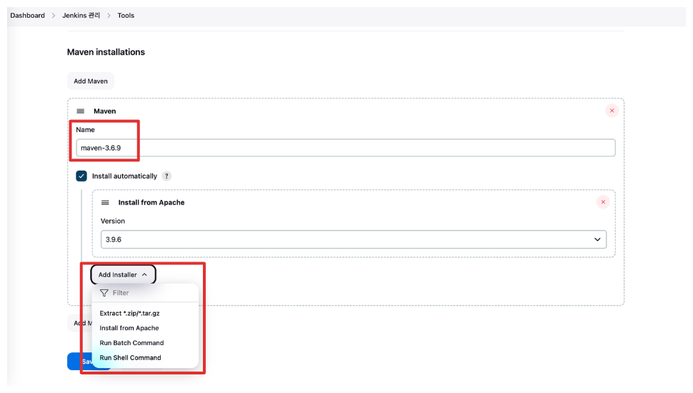 Maven은 설치되어 있지 않기 때문에 Install automatically 옵션을 체크하여 설치합니다. 젠킨스는 다양한 설치방식을 지원합니다.