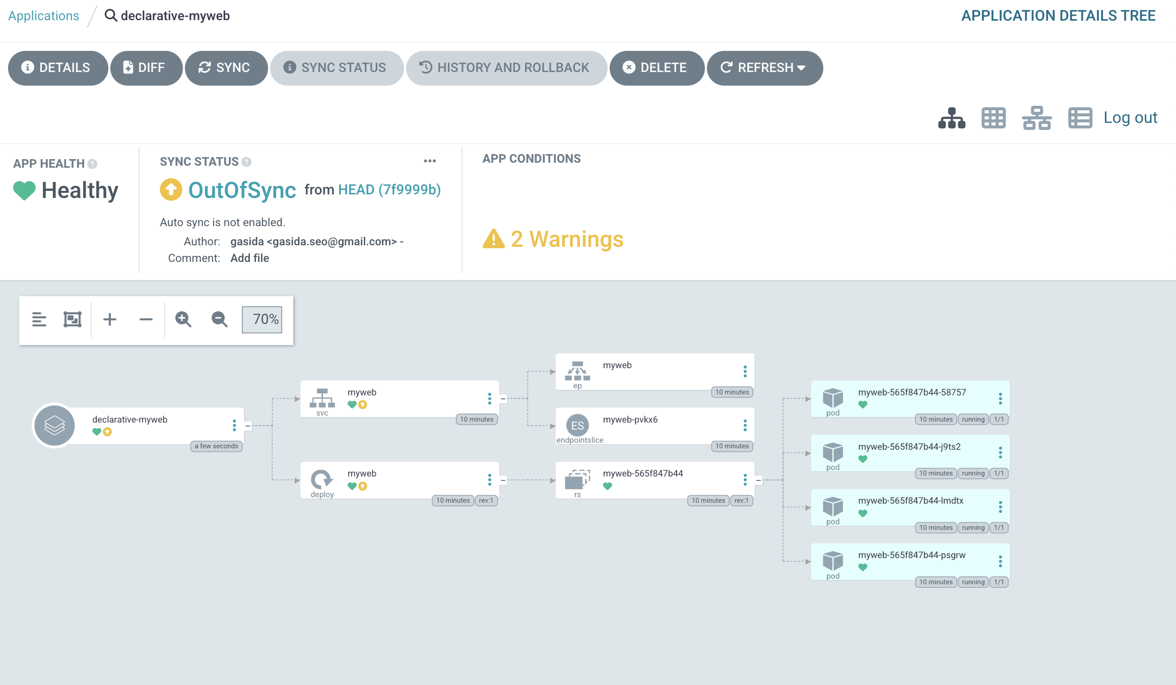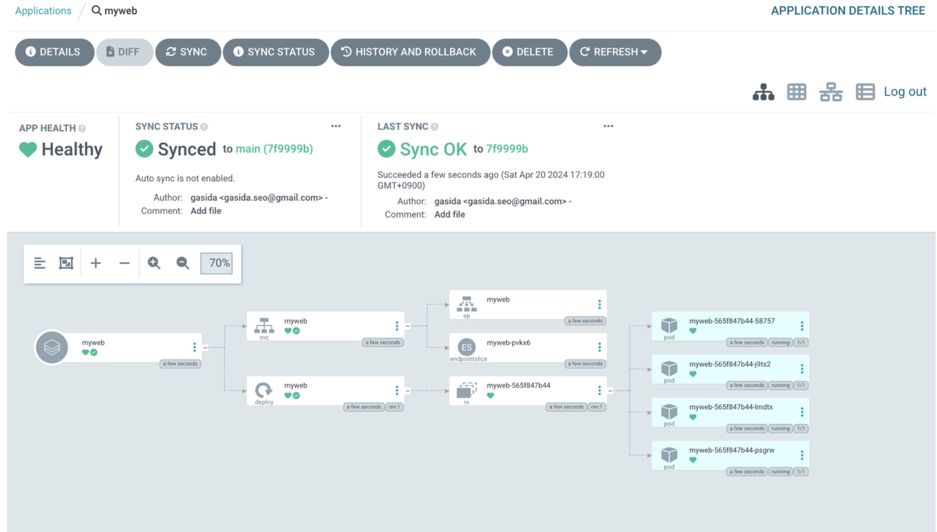 argocd app sync 명령어로 app을 배포합니다.