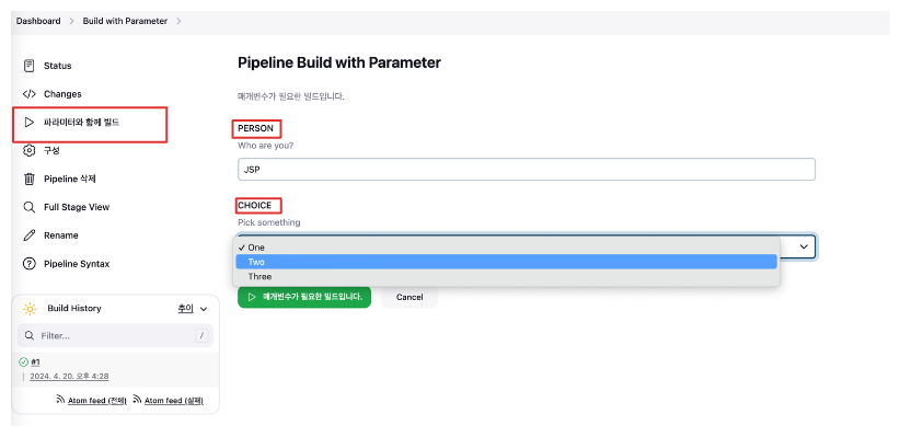 파이프라인 - 파라미터와 함께 빌드