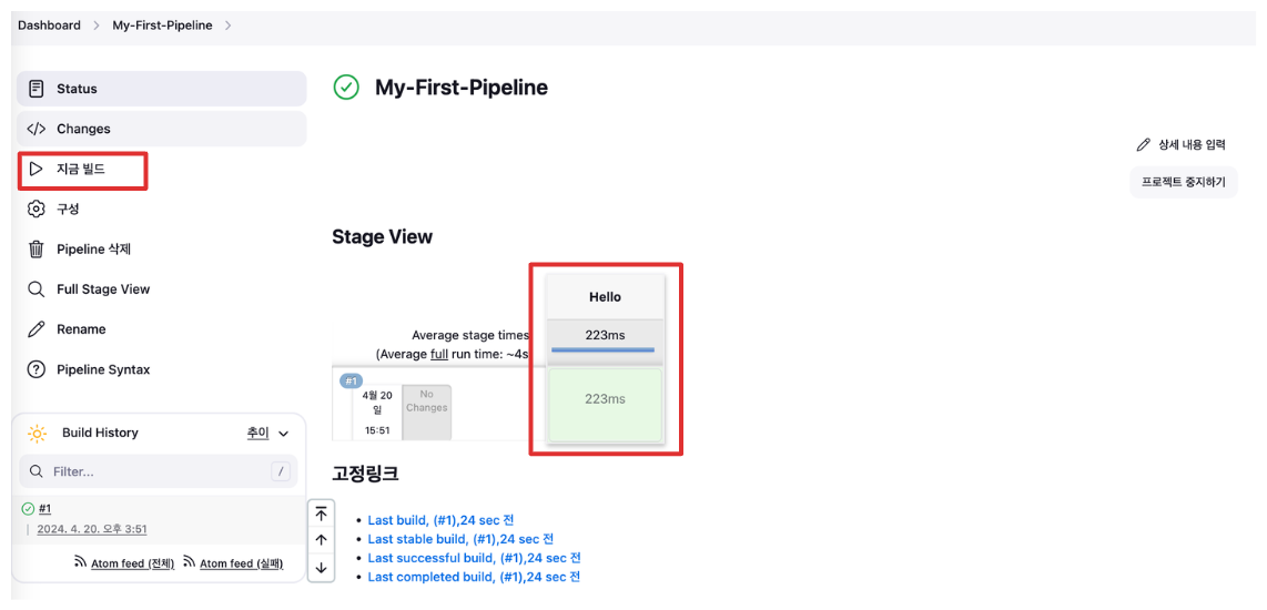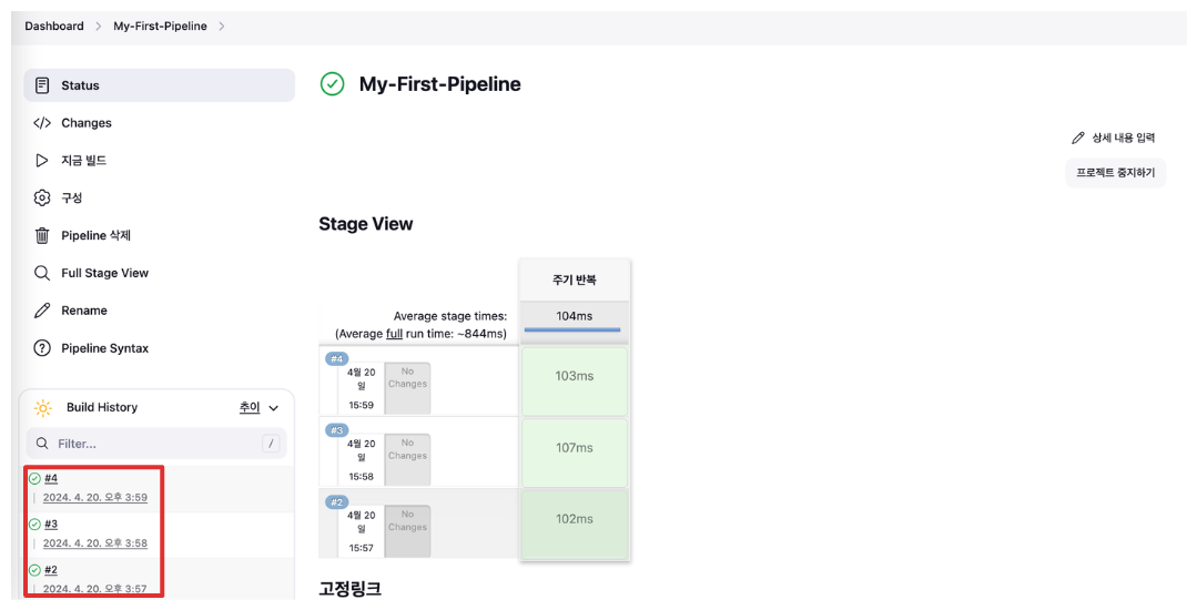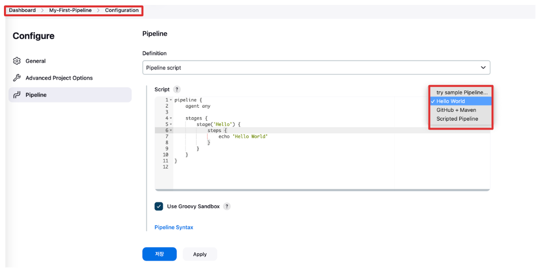파이프라인을 생성하고 sample 파이프라인 스크립트를 작성하고 실행결과를 확인합니다.