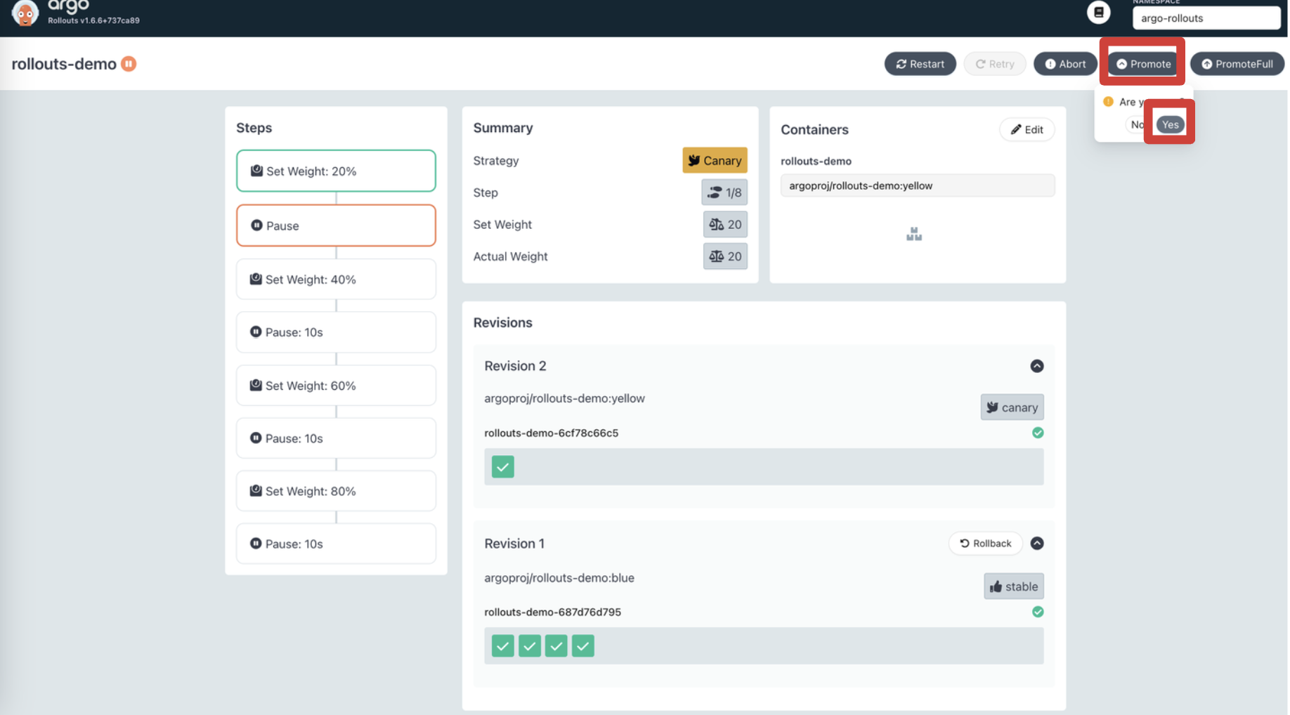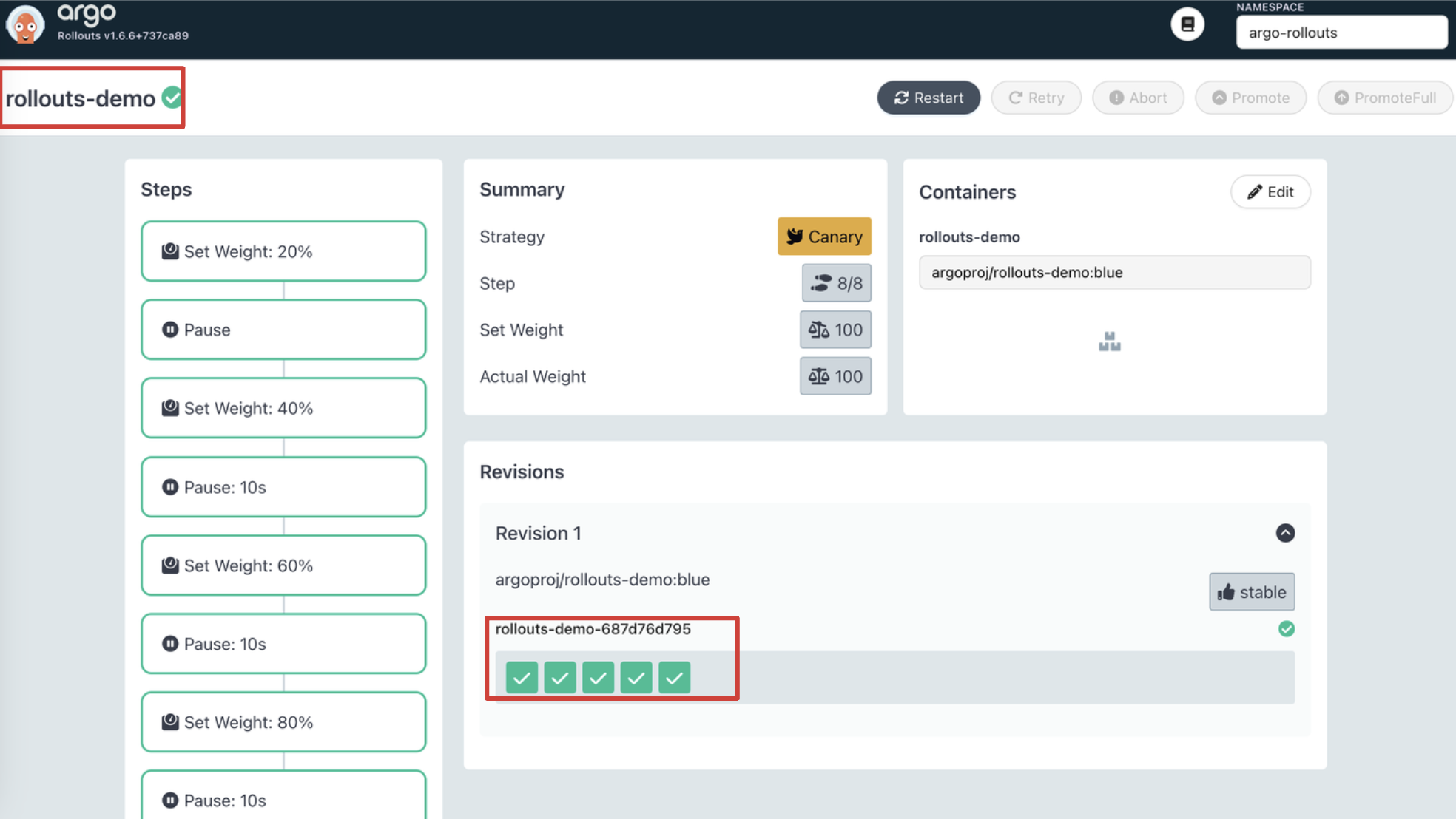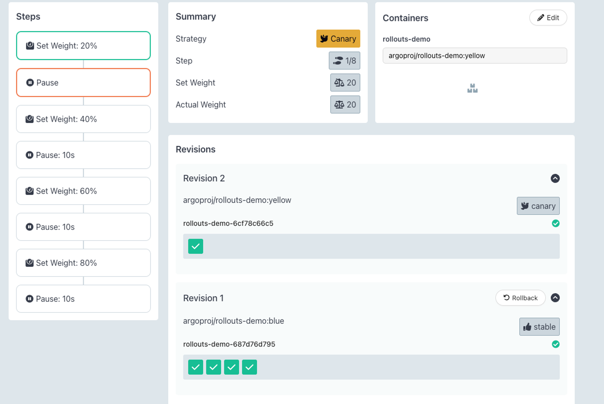 Rollout 대시보드를 통해 확인합니다. 각 스텝을 보기 좋게 한눈에 확인할 수 있습니다.