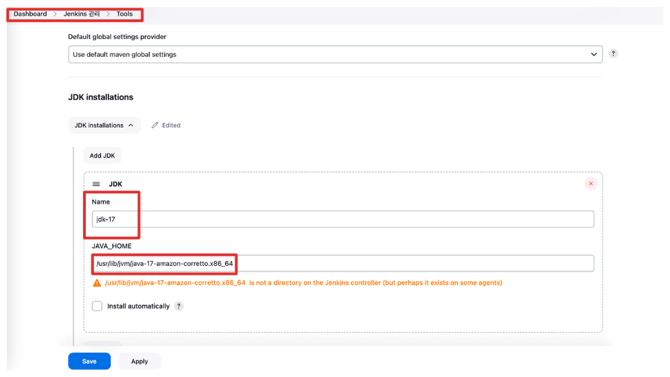 - 3. 이전에 Jenkins를 위해 설치해 놓은 JDK의 경로를 등록합니다.