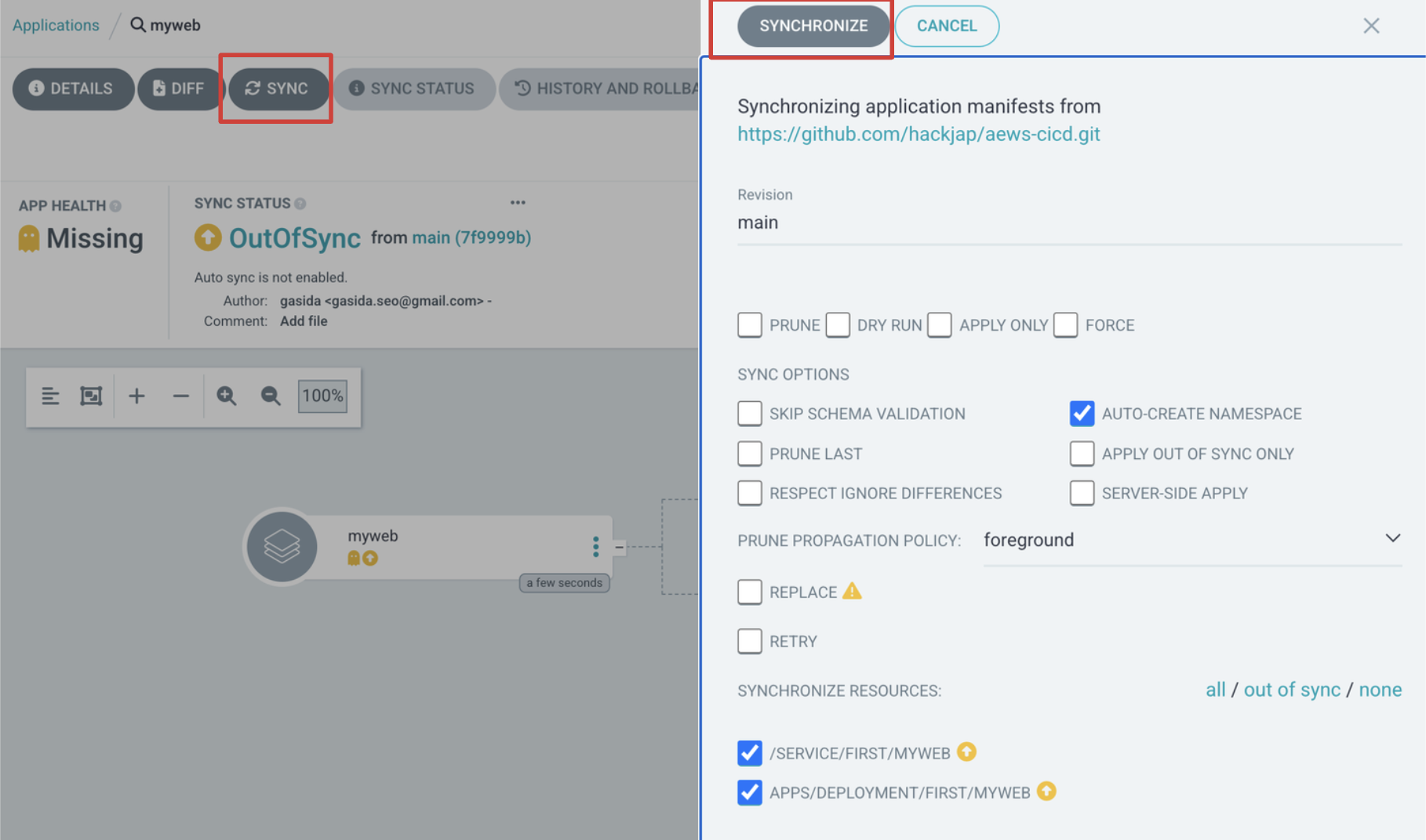 배포하기 - [SYNC] 클릭 > [SYNCHRONIZE] 클릭