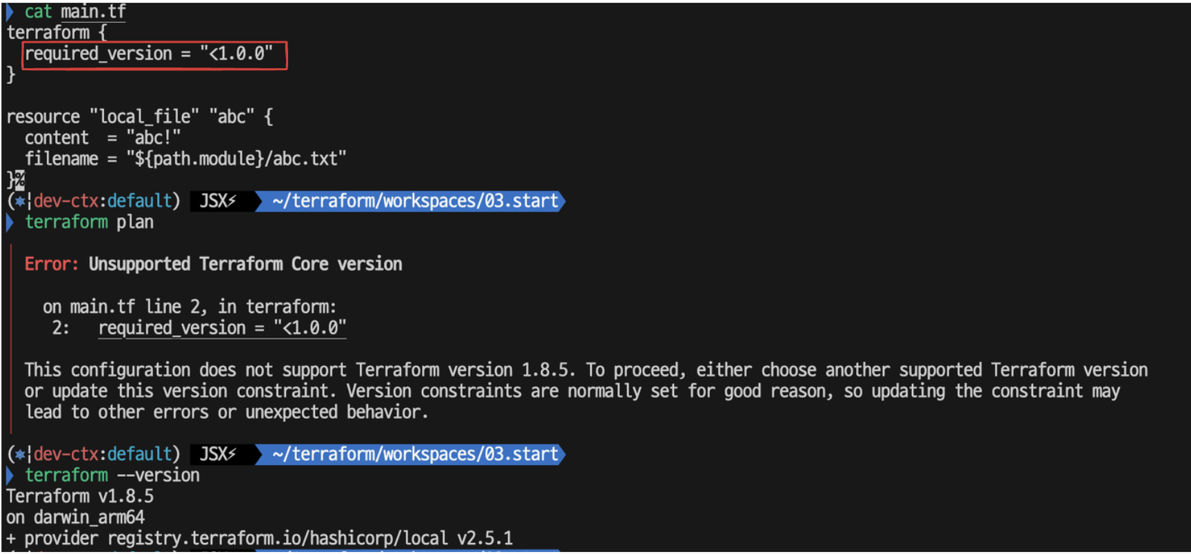 다음은 테라폼 1.0.0 이하의 버전을 요구하도록 설정합니다. 1.8.5 버전의 테라폼에서는 에러를 발생하는 것을 보여줍니다.