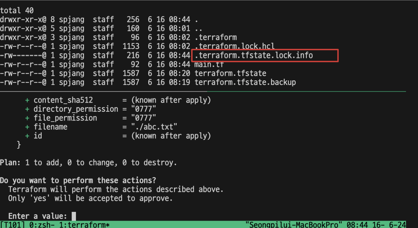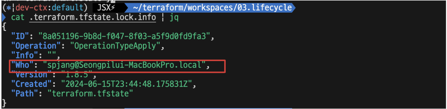 테라폼은 실행되는 동안 .terraform.tfstate.lock.info 파일이 생성되면서 해당 State를 동시에 사용하지 못하도록 잠금 처리를 합니다.
