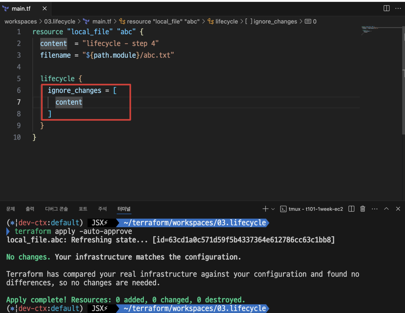 - ignore_changes (list): 리소스 요소에 선언된 인수의 변경 사항을 테라폼 실행 시 무시
