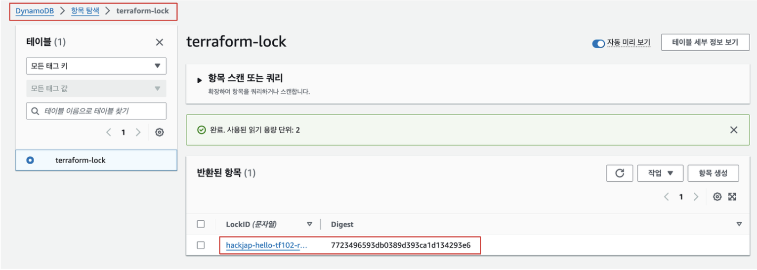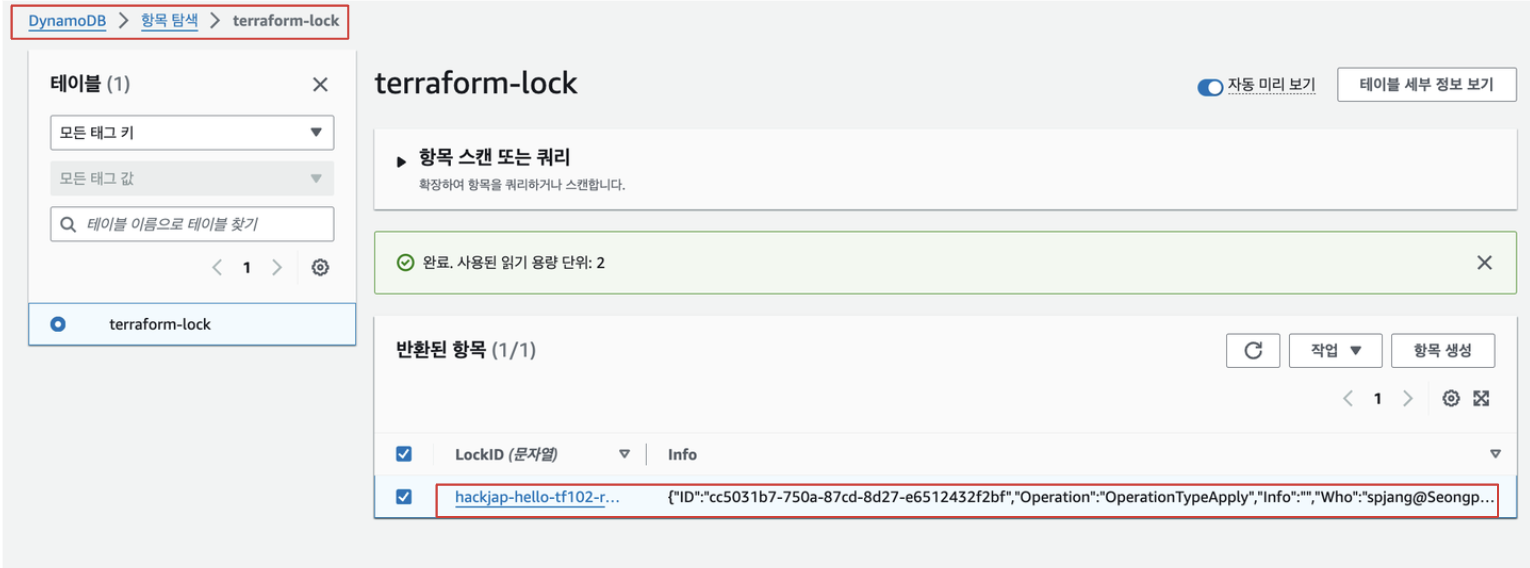 terraform apply 명렁어를 실행하고 승인 여부에 입력 전 후의 Lock 테이블의 변화를 확인해보면, 실행하기 전 Lock ID와 같은 Locking 과 관련된 정보를 보여줍니다. 실행 후에는 Lock info 값이 사라짐을 확인할 수 있습니다.