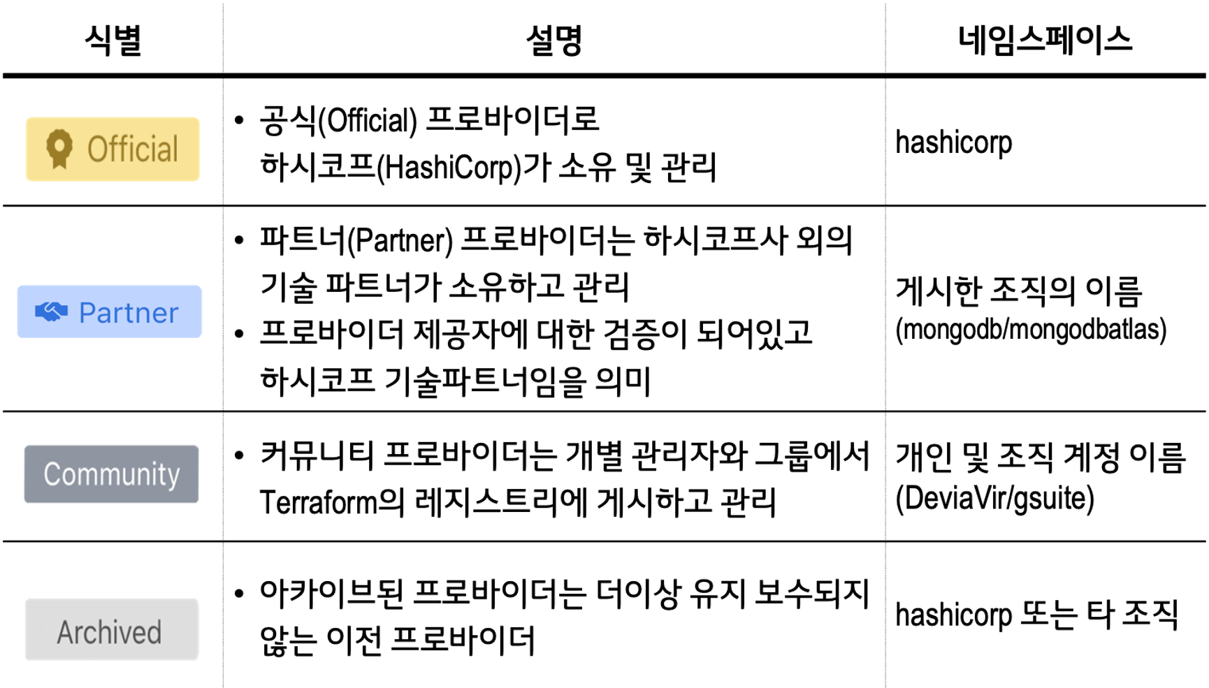 테라폼 레지스트리를 통해 수 많은 벤더사의 프로바이더를 제공합니다. 프로바이더 목록에는 유지 보수 및 게시에 권한에 따라 티어가 존재한다고 합니다.