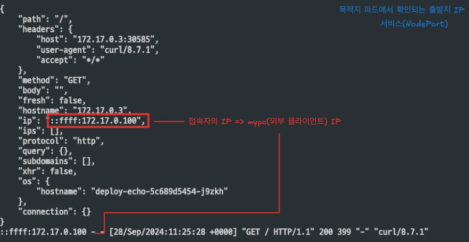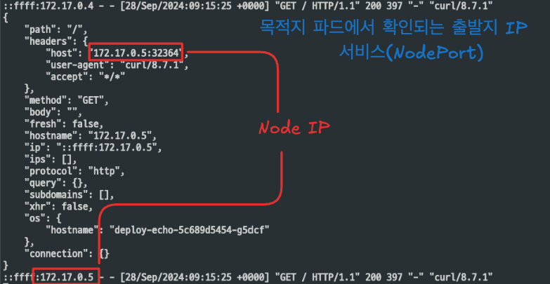 목적지 파드의 로그를 확인해보면 ClusterIP 와 다르게, 출발지 IP가 파드가 아닌, 노드의 IP가 출력됩니다.