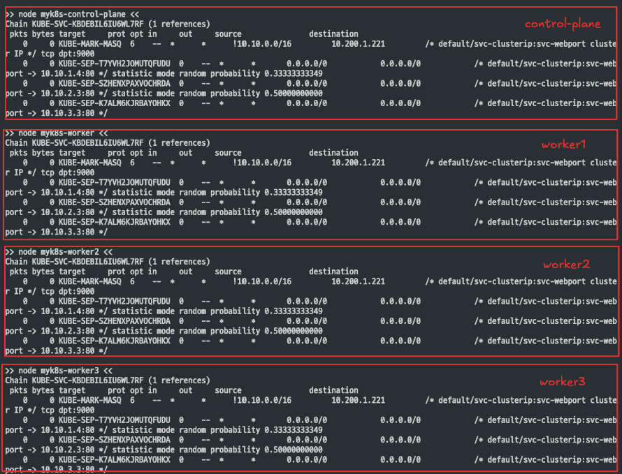 KUBE-SERVICES체인은 서비스(ClusterIP 또는 NodePort) 관련 트래픽을 처리합니다. NodePort는 ClusterIP를 포함합니다.ClusterIP가9000포트로 들어오는 패킷이KUBE-SVC-VTR7MTHHNMFZ3OFSF라는 서비스 관련 체인으로 전달됩니다.NodePort서비스와 관련된 트래픽은 마지막에KUBE-NODEPORTS체인으로 전달됩니다.