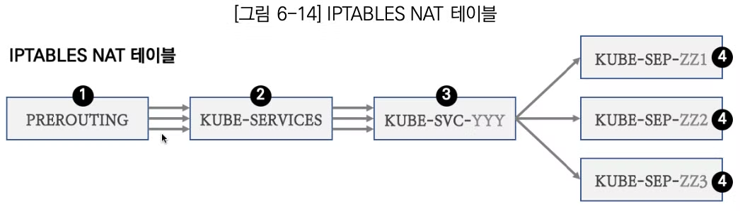 NodePort서비스를 처리하기 위한 추가적인 NAT 및 라우팅 규칙을 포함하고 있습니다.