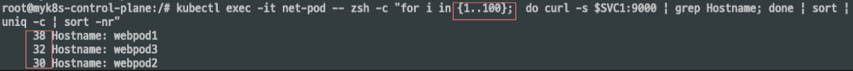 for pod in $WEBPOD1 $WEBPOD2 $WEBPOD3; do kubectl exec -it net-pod -- curl -s $pod | grep Hostname; done