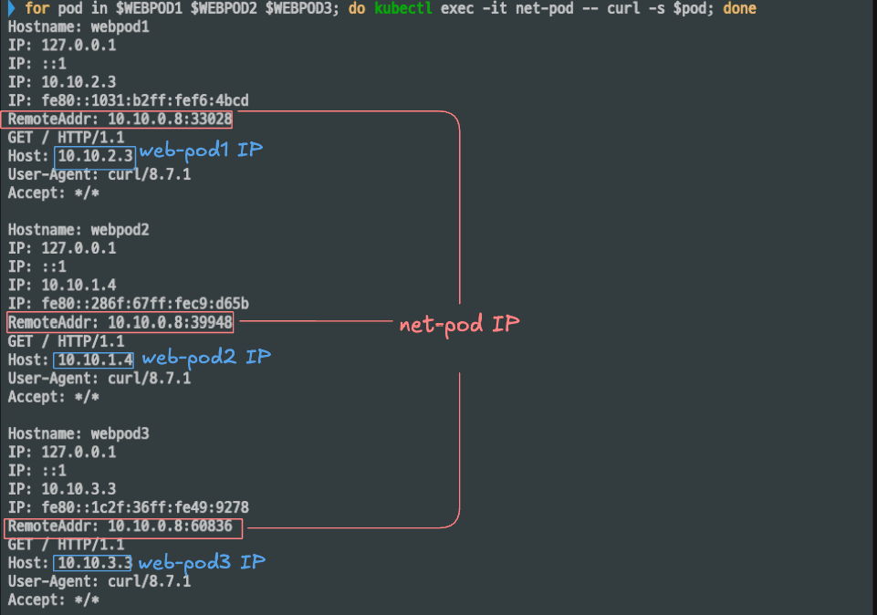 for pod in $WEBPOD1 $WEBPOD2 $WEBPOD3; do kubectl exec -it net-pod -- curl -s $pod | egrep 'Host|RemoteAddr'; done