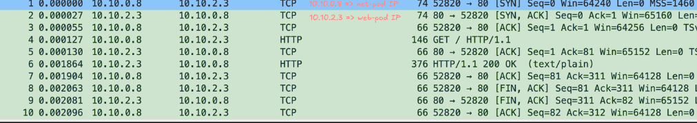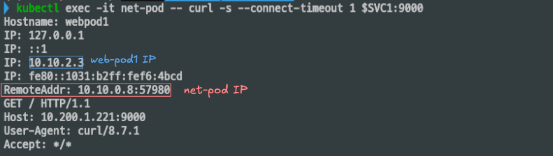 목적지 파드(web-pod)의 IP로 직접 접속 시, 응답헤더의 RemoteAddr는 출발지 파드(net-pod)의 IP가 출력됨을 확인할 수 있습니다.