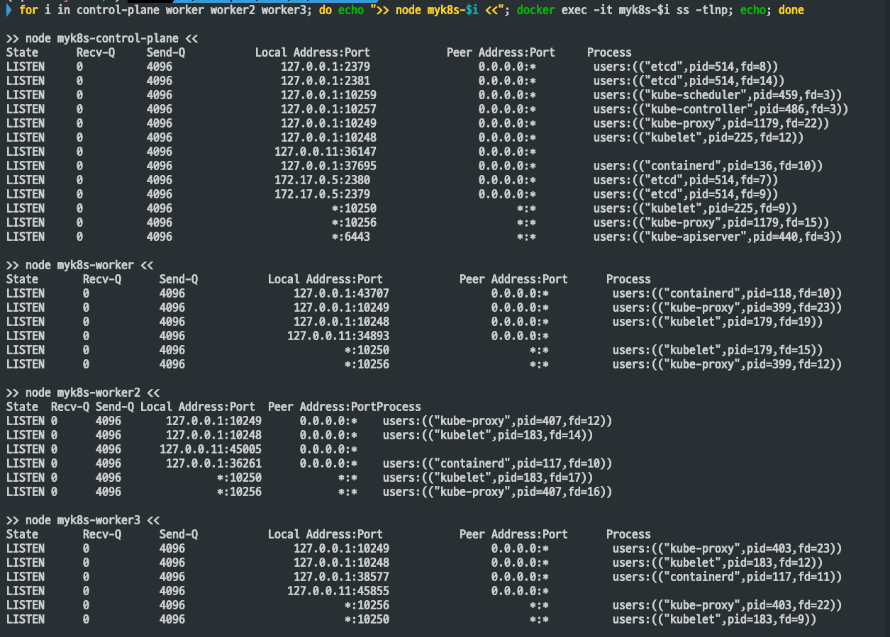 과거 쿠버네티스 버전은 각 노드에 노드포트가 Listen 되지만, 현재 쿠버네티스 버전에는 iptables rules 처리되어 포트가 노출되지 않습니다.