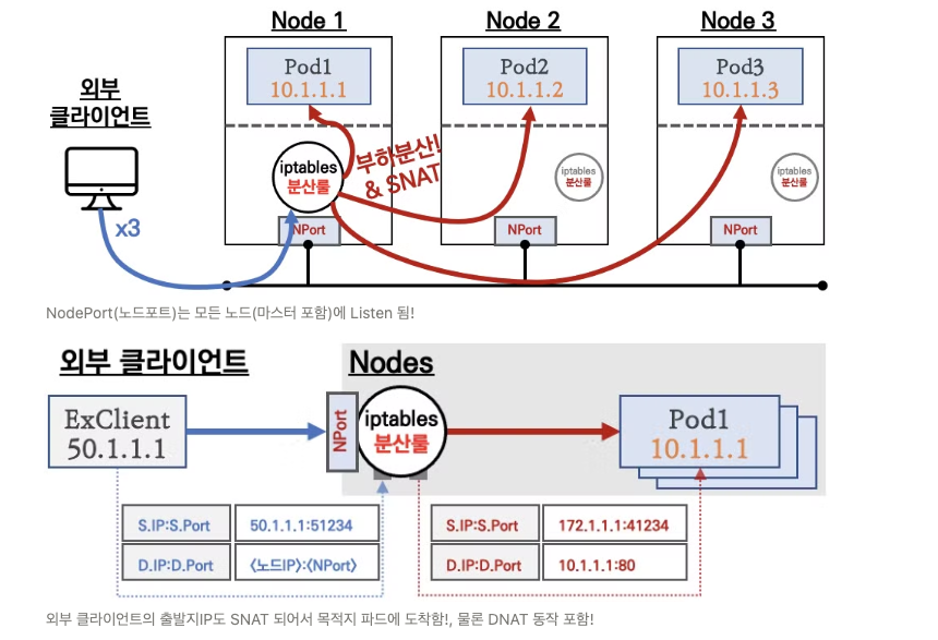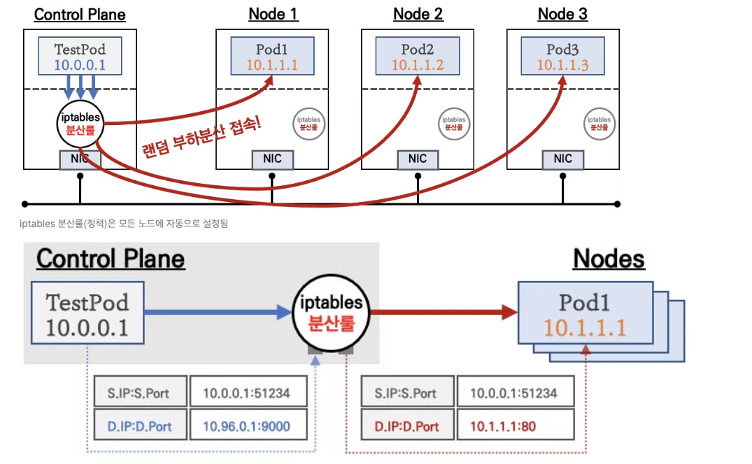 kube-proxy가 각 노드의iptables에 관련 규칙을 자동으로 설정하여, 모든 노드에서 동일한 방식으로 트래픽이 처리됩니다.