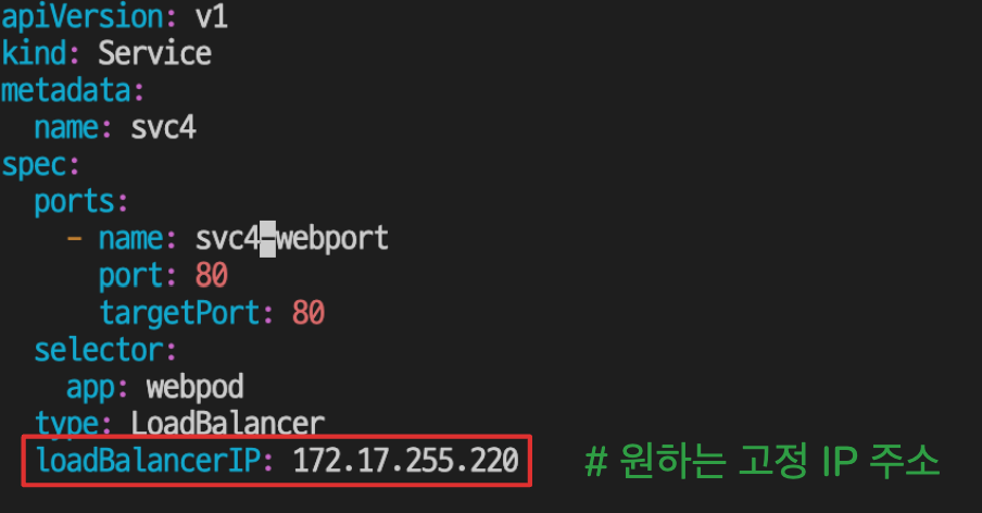 fixed IP 설정EXTERNAL-IP를 고정된 IP로 설정하고 싶다면 아래 필드를 추가하면 됩니다. 주의할 점은 IPAddressPool에서 지정한 IP대역의 IP로 설정해야 합니다.