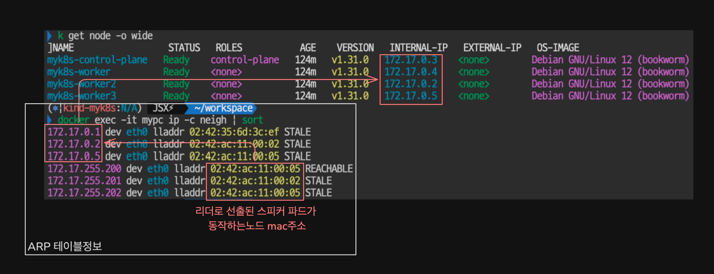 (*실습 환경에 따라서, 리더 스피커 파드의 배치된 노드가 다르거나, 할당된 IP가 다를 수 있습니다.)