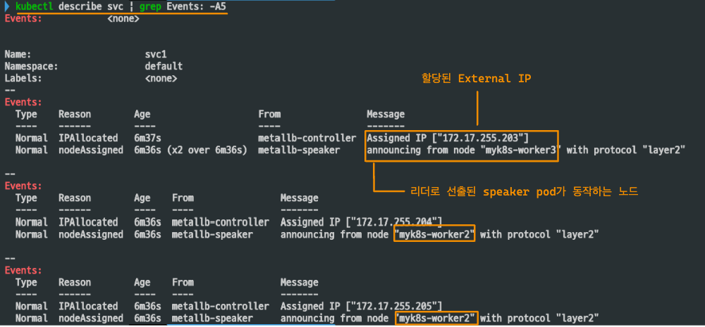 Assigned IP ["172.18.255.201"]: MetalLB가 LoadBalancer 타입의 서비스에 할당한 외부 IP로, 외부에서 접근할 때 사용하는 External IP입니다.metallb-speaker가 해당 IP를 myk8s-worker 노드에서 광고하고, 외부 클라이언트의 트래픽을 이 노드로 전달하도록 설정합니다.