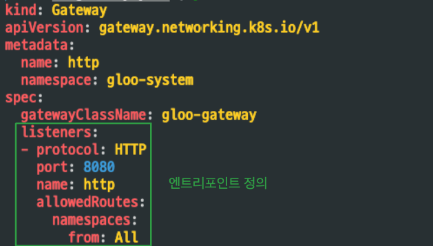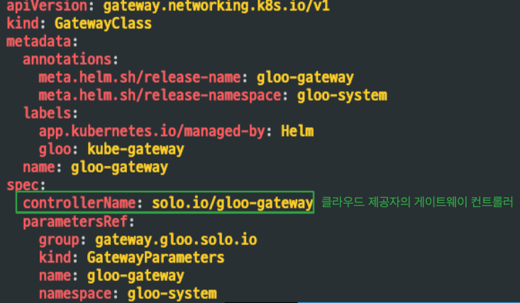 GatewayClass는 네트워크 인프라의 템플릿 역할을 합니다. 클러스터에서 사용할 수 있는 Gateway의 유형을 정의하고, 특정 클라우드 제공자의 게이트웨이 컨트롤러 연결합니다. ingress의 ingressClass, pv의 storageclass와 유사하다고 할 수 있습니다.