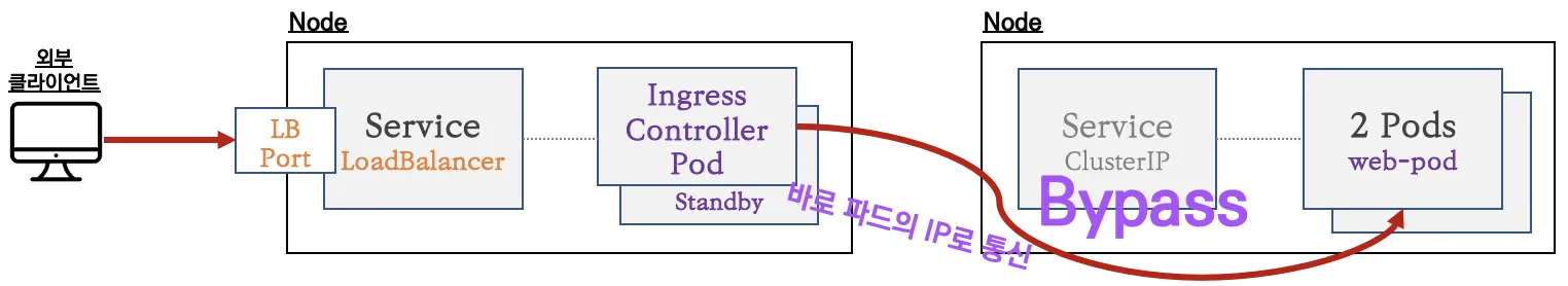 인그레스 컨트롤러 파드는 K8S API서버로부터 서비스의 엔드포인트 정보(파드 IP)를 획득 후 바로 파드의 IP로 연결합니다.