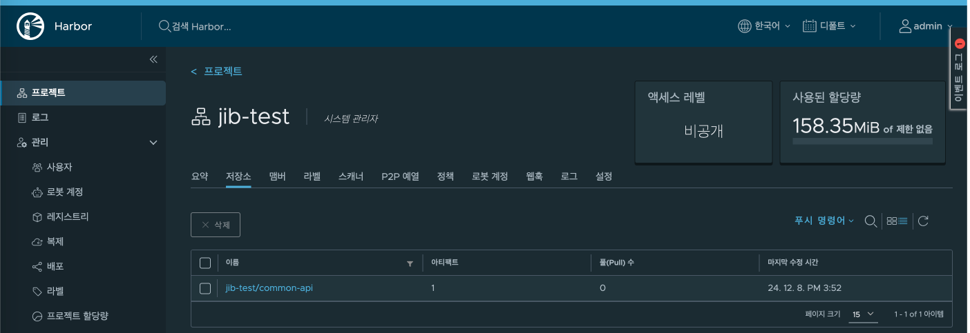 common-api라는 샘플 애플리케이션 모듈을 jib를 통해 빌드하였으며, 이미지 레지스트리로는 Harbor를 사용했다.