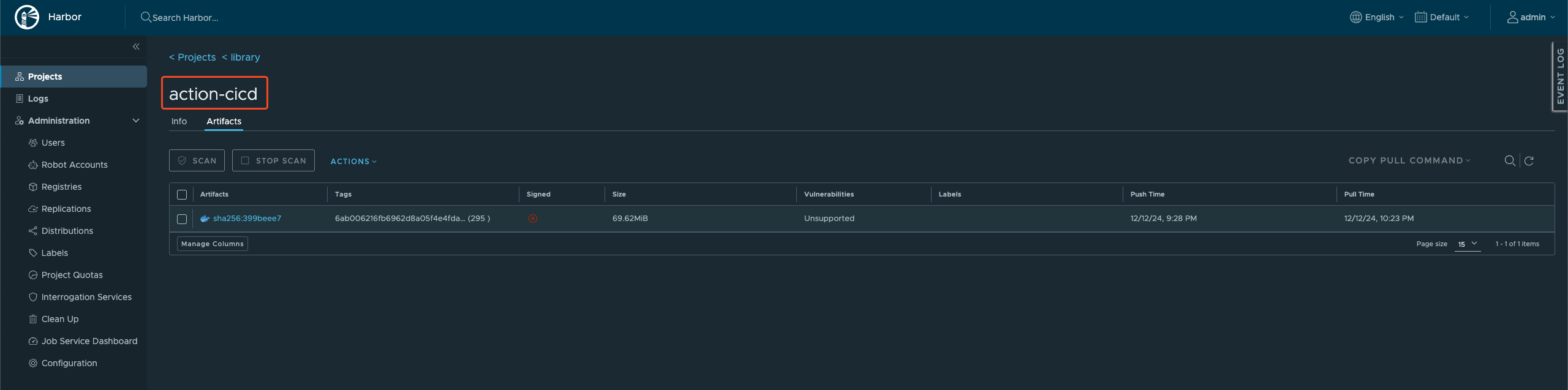 이미지 레지스트리는 Harbor를 사용했으며, 설정한 Docker 이미지가 성공적으로 푸시된 것을 확인할 수 있다.